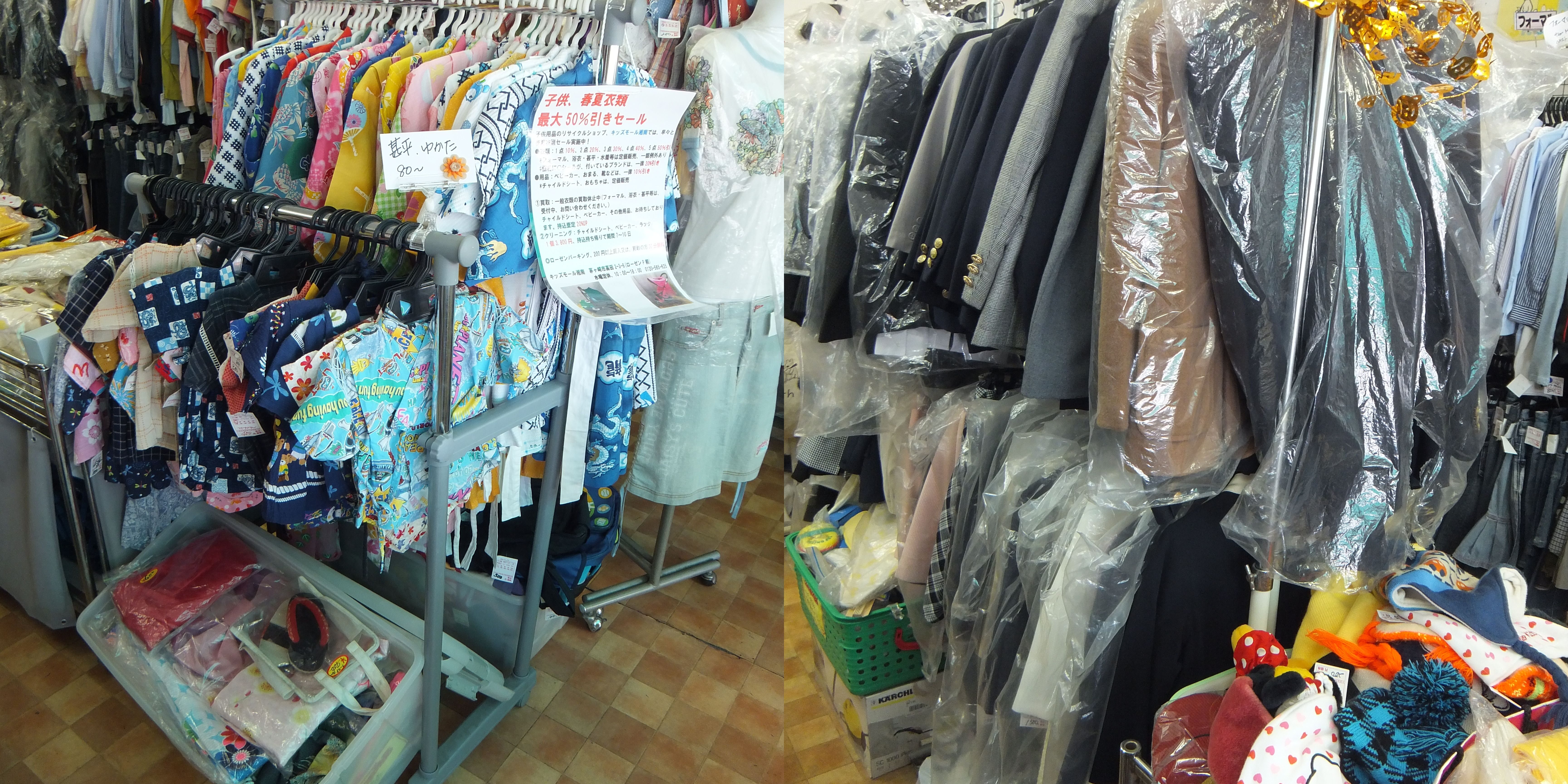 浴衣・甚平等50点以上展示中、水着も多数。 フォーマルはベビーから160cmまで100点以上揃えております。ぜひ一度お越しください。 Post navigationPreviousPrevious post:スキーウェア/フォーマル服女子・男子を大量にご用意展示販売中NextNext post:子供自転車・三輪車・足こぎ自動車・大型遊具多数販売中