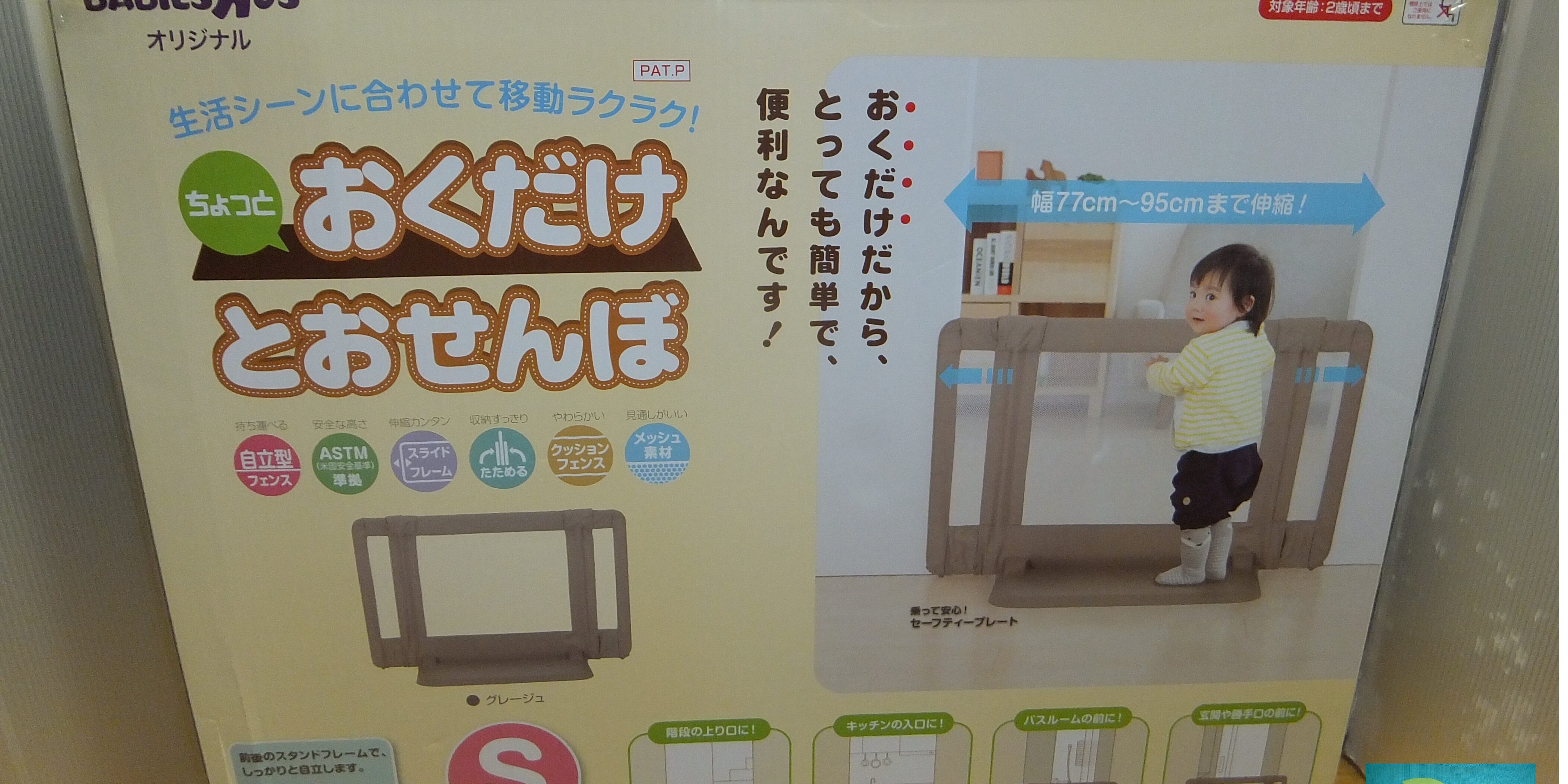 ●日本育児製造の、ベビーザらスオリジナル、ちょっとおくだけとおせんぼSです。 お子様ひとり使用で、綺麗です。 ●対象:~満2歳頃まで。 廊下、階段の上り口、キッチン等、簡単におけて便利です。スタンドフレームを、前後に倒すと底の幅が約65cmとなり安定しています、片側にはセーフティプレートが付いています。 ●サイズ:奥行約65cm(スタンドフレームを左右倒した場合。)X高さ約60cmX幅77~95cm。5,000円 Post navigationPreviousPrevious post:ベビー・子供用品買い取り販売/キッズモール湘南茅ケ崎/ゼウスターンEG ZZ/新生児~4歳頃/11,500円NextNext post:ベビー・子供用品買い取り販売/キッズモール湘南茅ケ崎/アンジェリーノ/子乗せ自転車/5,500円