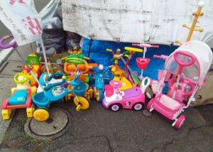 ①一輪車、黄、14インチ 1,300円②キックボード、1,200~1,500円。③三輪車、1,700~5,000円、④乗用玩具(車)900~1,500円。