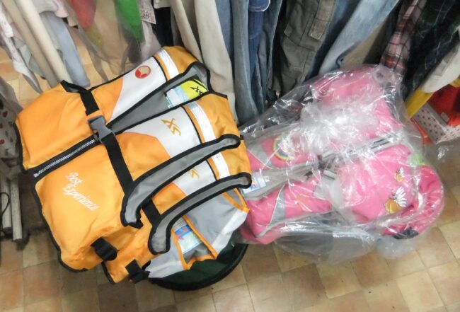 夏の必需品、ライフジャケット、ラッシュガード、水着、多数用意しております。 ライフジャケットをお子さんが着ていれば、緊急の時も親は冷静に判断ができます。サイズは、SML、700~1,300円程度 お守りと思ってご用意くだ…