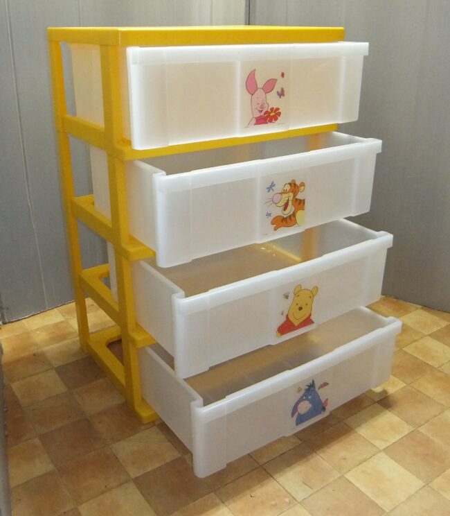 アイリスオオヤマのキッズチェストです。4段のプラスチック製(2台あります。) サイズ:外径、W54XD39XH79cm。引き出しの内径、約W48,5XD35XH16cm。900円